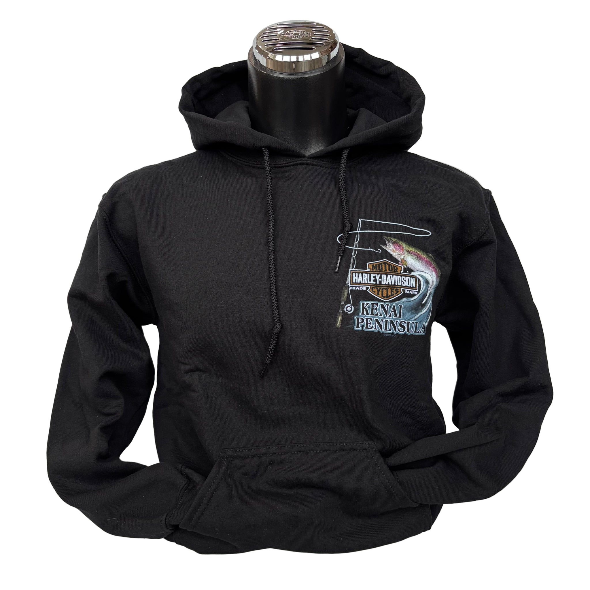 Our custom Kenai Peninsula Harley-Davidson hooded sweatshirt is a great Alaska-themed hoodie anyone would want! The front displays a fishing rod and salmon. The back displays a gal holding a fishing pole, a blue Harley, and a scenic river with forest. The float plane is flying low over the water. "Kenai Peninsula Harley-Davidson" is written in huge letters.